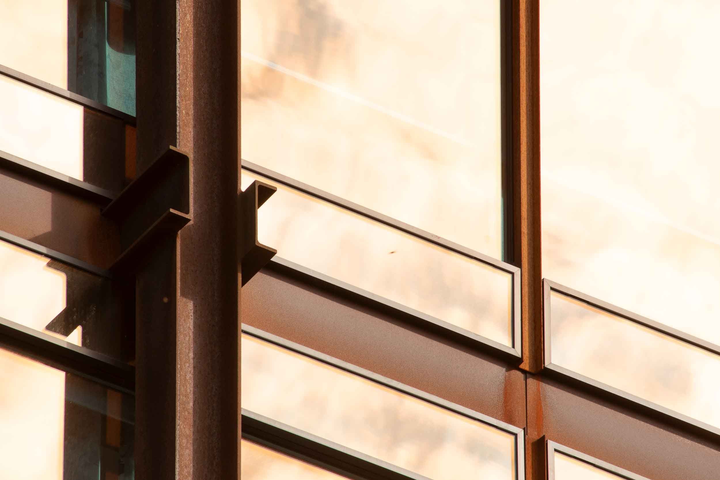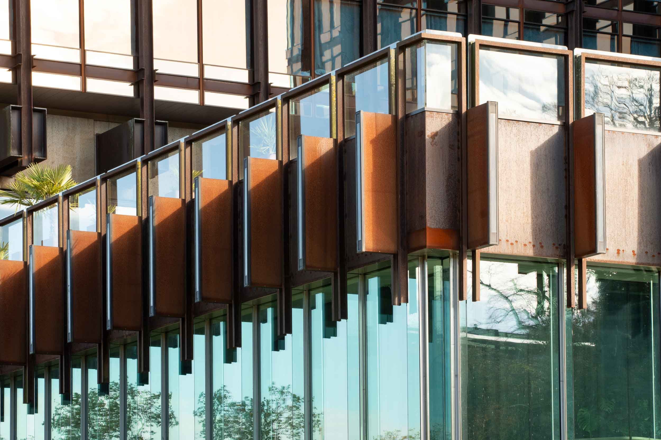 De originele buitengevel van weervast staal (‘corten’) bleef behouden. De interventie waarrond het ontwerp opgebouwd is, is een cirkelvormige vide die centraal in het plan gecreëerd wordt. De nieuwe hal, met een diameter van bijna 21 m en drie verdiepingen hoog, scharniert tussen voor- en achterbouw en verbindt zo de parking met het hotel en de kantoren.