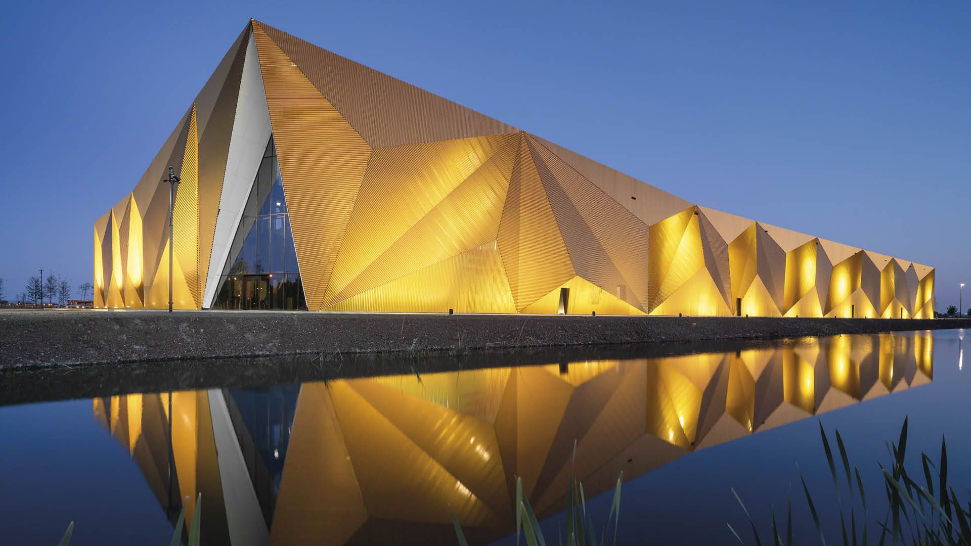 L’extérieur du nouveau bâtiment de la Monnaie royale néerlandaise ressemble à un coffre-fort, avec quasiment aucune ouverture visible. Les facettes de la façade extérieure sont inspirées du relief propre aux pièces d’euros frappées aux Pays-Bas.