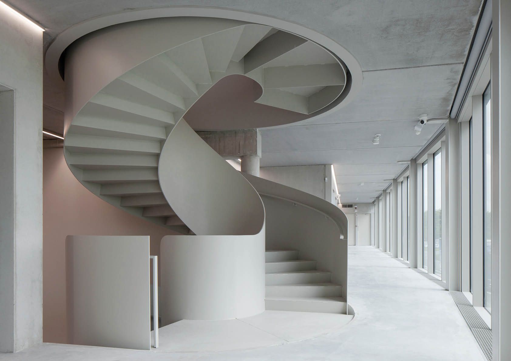 La recherche d'un design élégant a abouti à la réalisation d'une structure autoportante en acier de 7,8 tonnes. L'escalier a été préfabriqué en atelier, en sections de deux étages. Elles ont été placées via une ouverture dans le toit et fixées à des platines de raccord et des goujons, qui avaient déjà été prévus dans le gros œuvre. Les paliers ont été inclus à l'intérieur du volume de l'escalier. A ces endroits, les balustrades ont été prolongées, ce qui fait que l'interruption n'est pas visible dans le volume. Cela crée un escalier architectural imposant avec une forte présence.