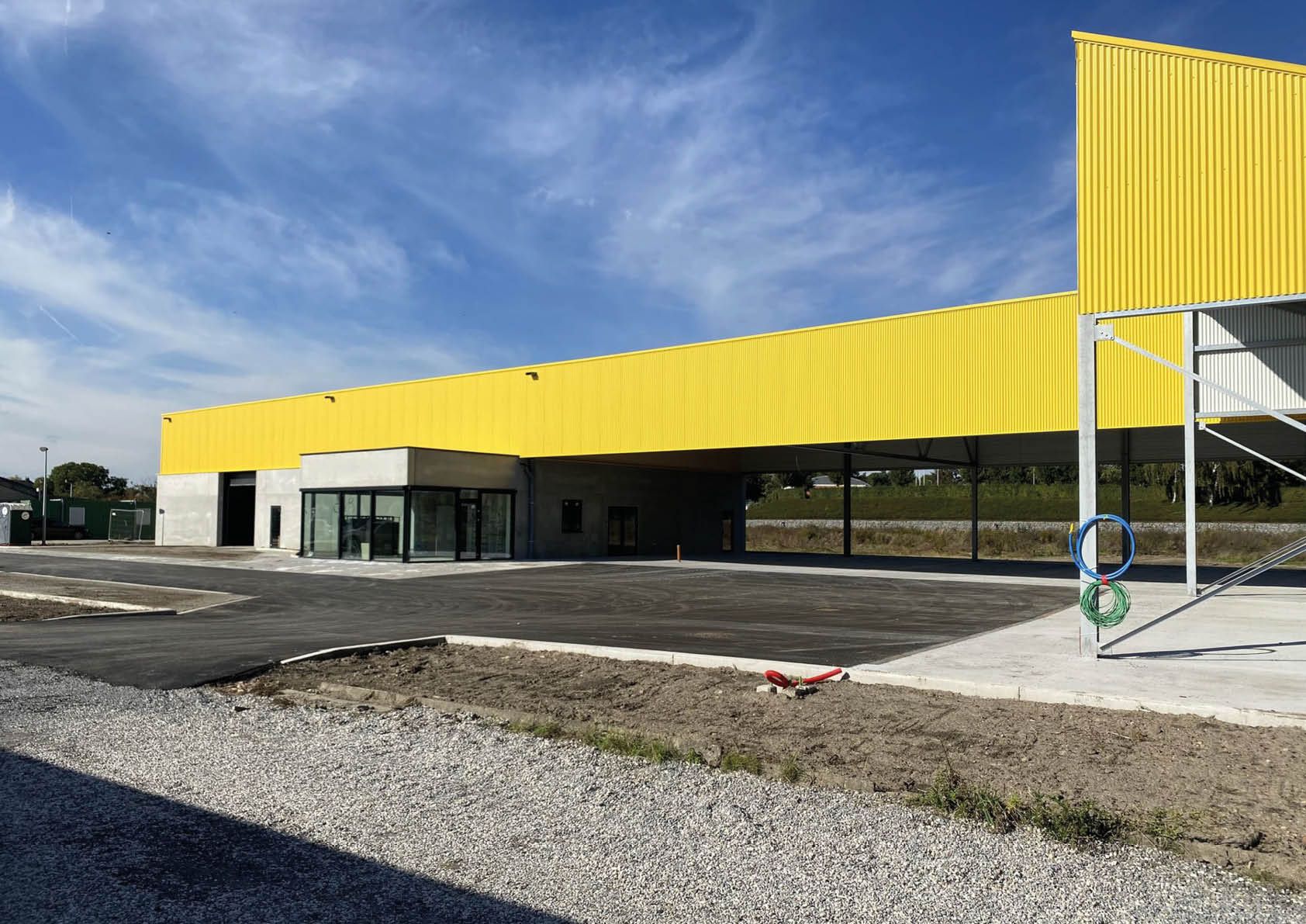 Le bâtiment se scinde en deux, avec le hangar d'un côté et l'auvent de l'autre. Au fond de l'abri, une "plinthe" en panneaux de béton forme un bel ensemble avec les blocs de béton pour le stockage du sel de voirie. Le volume supérieur du bâtiment s'étend comme un auvent au-dessus du parking où seront garées toutes les voitures de l'entreprise. Les tôles d'acier profilées procurent au bâtiment un aspect frais et contemporain. Les cadres de fenêtres et les portails en aluminium noir complètent le logo noir et jaune de Kapelle-op-den-Bos.