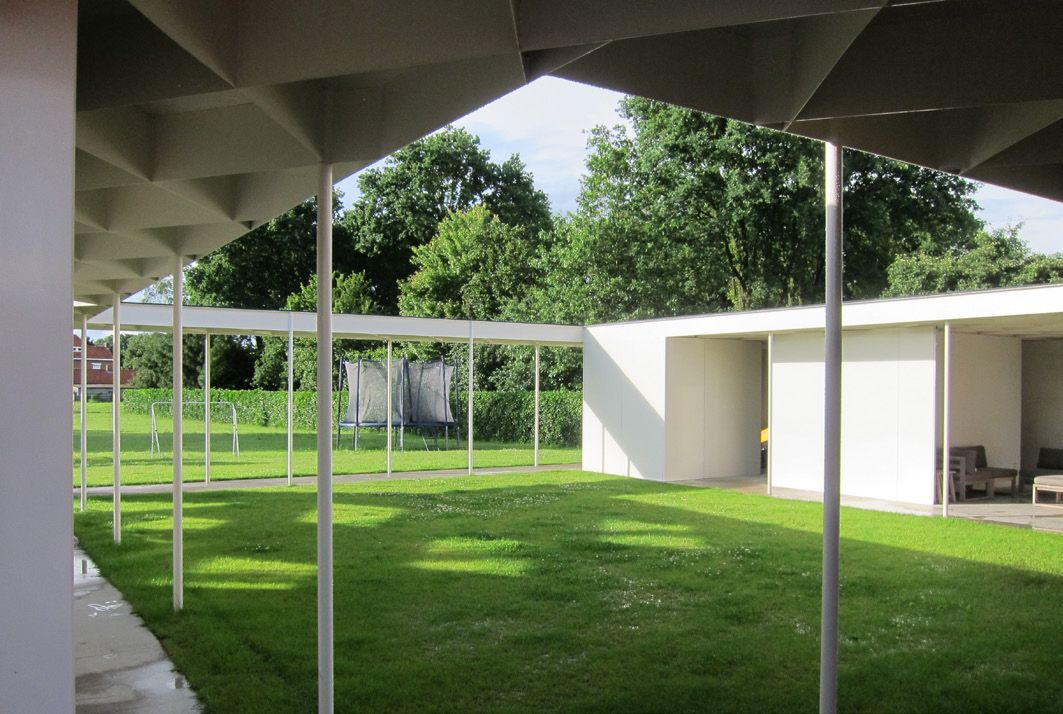 L’auvent en acier qui contraste avec l’habitation de mineur à Houthalen confirme le caractère solitaire de la maison isolée et se réfère à l’arrière-corps flamand caractéristique. Le programme pour l’auvent est constitué d’un double garage, d’un abri à vélos, d’un abri de jardin, d’une étable, d’une entrée couverte et d’une terrasse couverte. La toiture est constituée de 26 éléments qui ont été préfabriqués en atelier. Les ailettes de support (épaisseur de 4 mm) et les nervures latérales (épaisseur de 6 ou de 10 mm) ont été soudées sur la plaque de toiture (épaisseur de 3 mm).