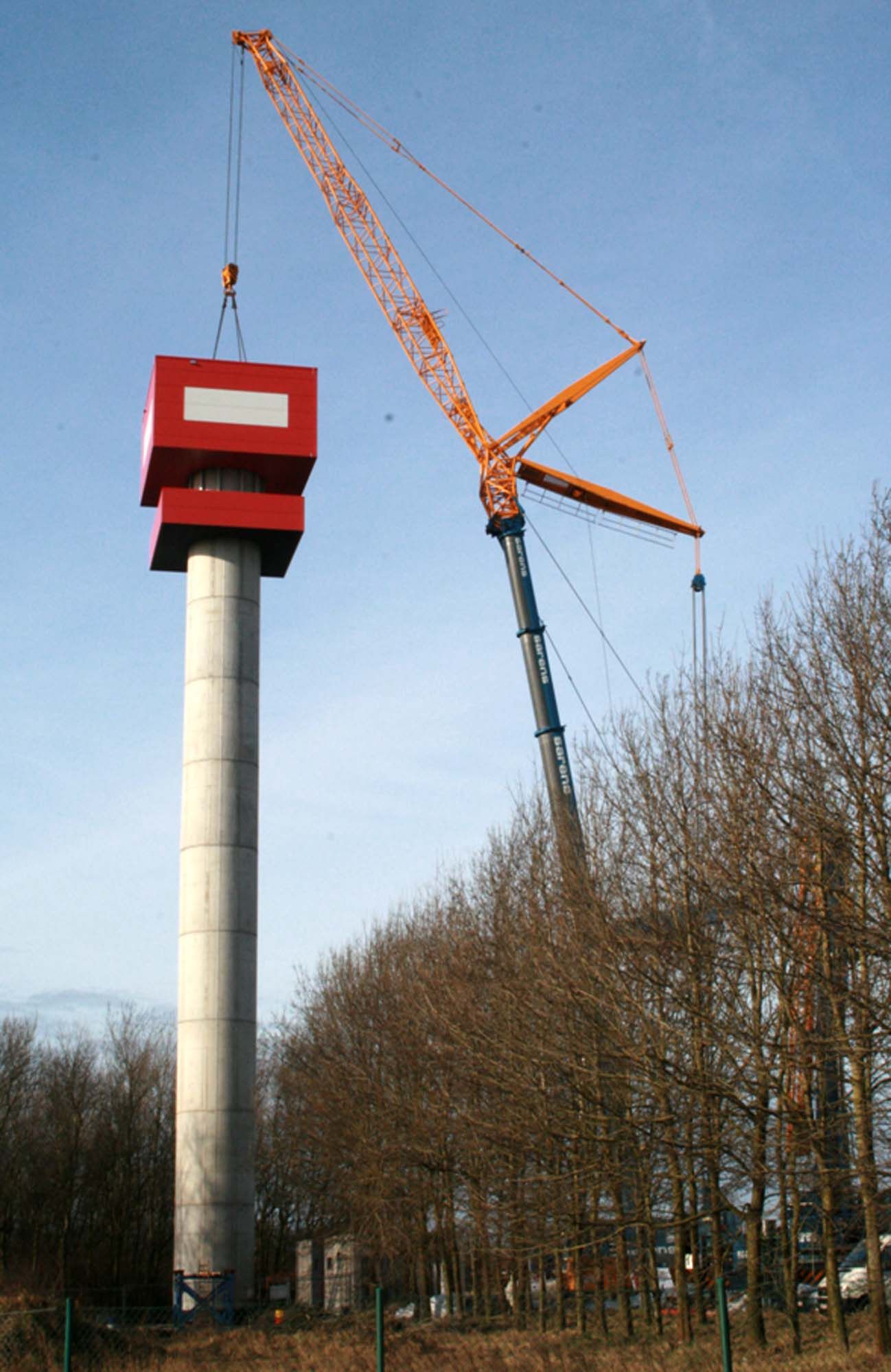 À Jabbeke, la Régie des Bâtiments a fait ériger une tour radar météorologique destinée à l’IRM. Le projet comprend la construction d’une tour d’accès haute de 45 m, surmontée d’une structure en acier devant abriter l’appareillage pour les mesures météorologiques. La construction est constituée d’un noyau surmonté d’une construction en acier de 50 tonnes. Un escalier à vis a été érigé en quatre parties qui, l’une après l’autre, ont été fixées avec la plus grande précision au corps en béton. La construction de la partie sommitale est une boîte carrée sous laquelle est attachée une plateforme d’accès. La hauteur et la forme de la tour ont amené les concepteurs à tenir compte dans une grande mesure de l’influence des vents et de l’effet tourbillonnant.