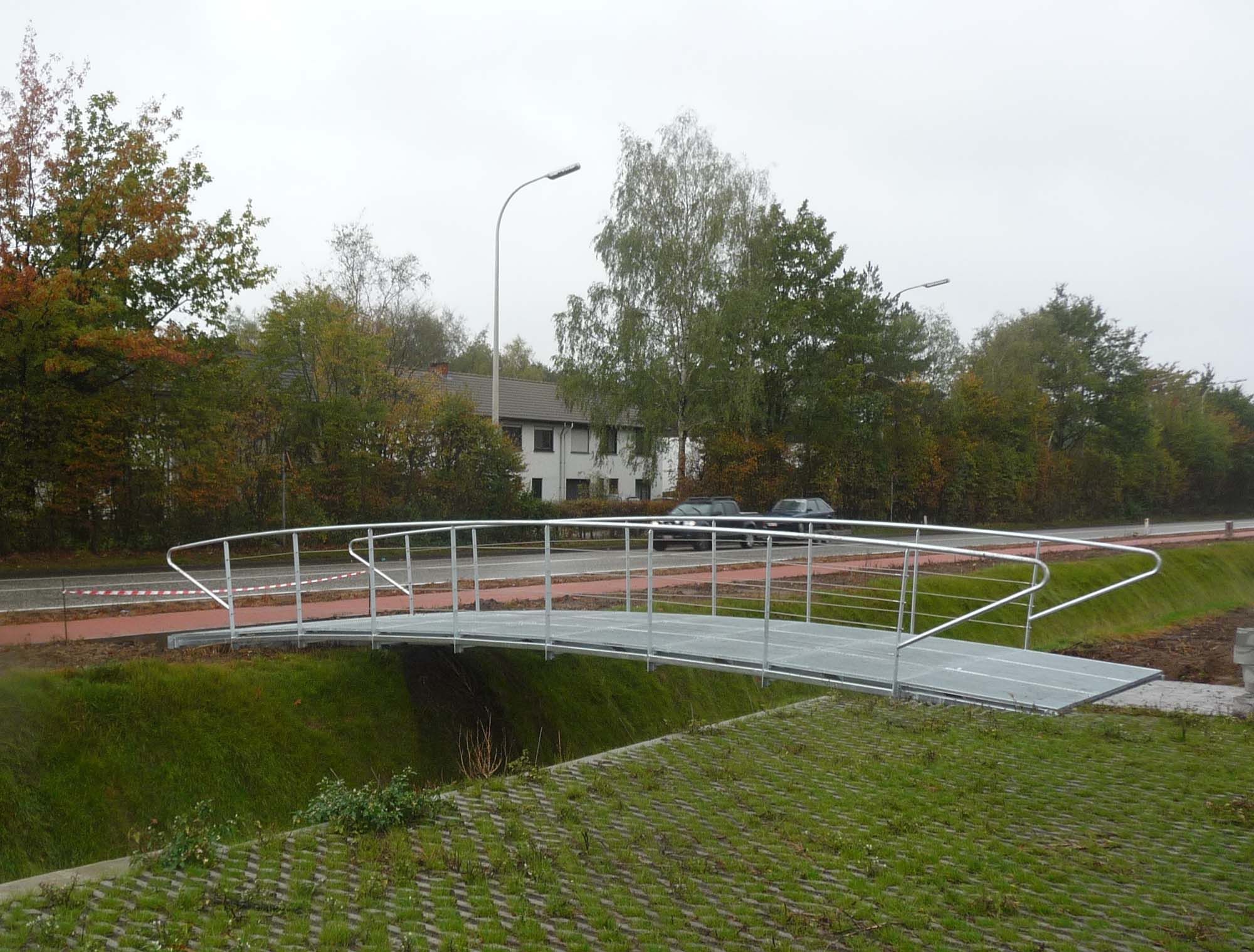 Pour assurer la liaison entre les terrains industriels et les bureaux de la caserne Lieutenant Coppens à Brasschaat, la commune souhaitait de petites passerelles légères. Pour satisfaire cette volonté, le choix s’est porté sur la conception de passerelles papillon. Les passerelles papillon ont une structure portante asymétrique en forme de papillon. Celle-ci reprend de manière optimale la charge uniforme et les efforts de torsion. La passerelle papillon est élégante et expressive et demande un minimum de matériau. Les portées peuvent aller jusqu’à 24 m. La structure en acier est galvanisée.