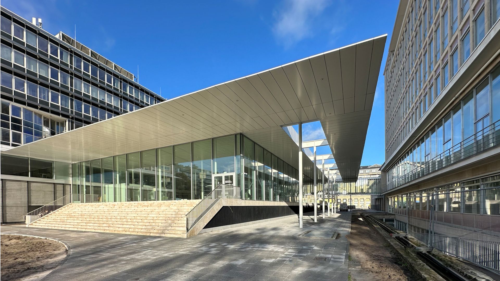 Une structure de toit complexe avec des poutres primaires et secondaires sur des colonnes de 6 m de haut tous les 7,2 m repose sur un socle (le parking à vélos) construit au-dessus d'un parking souterrain existant.  Soutenir la structure métallique de la toiture et des auvents (55x34 m) sur 35 colonnes très élancées est une prouesse en termes d'étude de stabilité. De plus, compte tenu de la présence d'un mur-rideau composé de panneaux de verre en profilés d'aluminium de 6 m de haut, la structure métallique de la toiture ne peut se dilater que de 3 mm sur toute sa longueur et sa largeur.