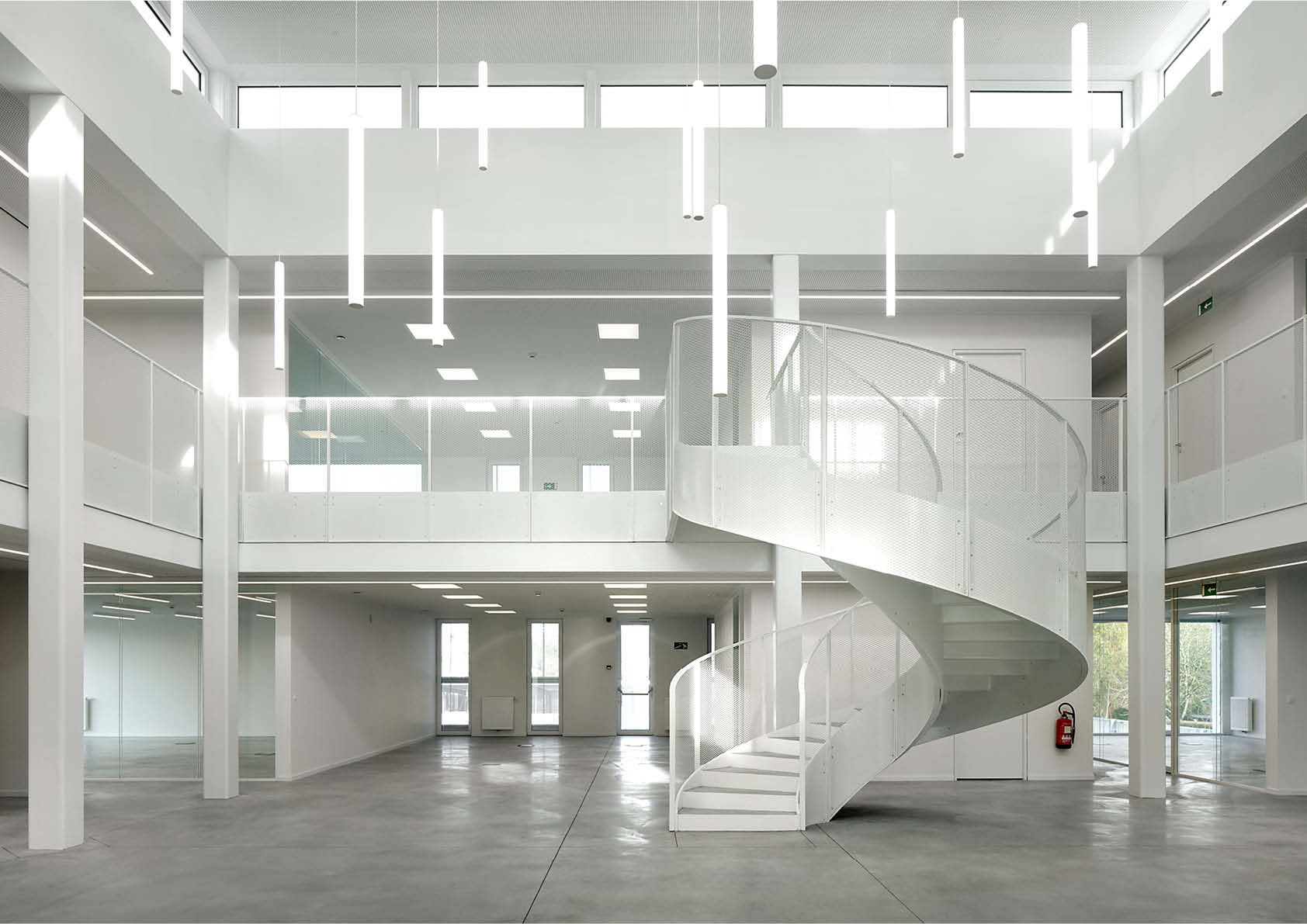 Het gebruik van S255- en S355-staal bood een grote vrijheid qua vorm, textuur en toepassing. De gevels zijn afgewerkt met een aluminium beplating op een frame in gegalvaniseerd staal. Natuurlijk licht wekt het gebouw tot leven, naargelang het tijdstip van de dag, en speelt met de geplooide, glanzende en geperforeerde textuur van de aluminiumbekleding. Binnen is een monumentale wenteltrap in wit gepoedercoat staal gerealiseerd, die de abstracte esthetiek van de gebouwschil herneemt.