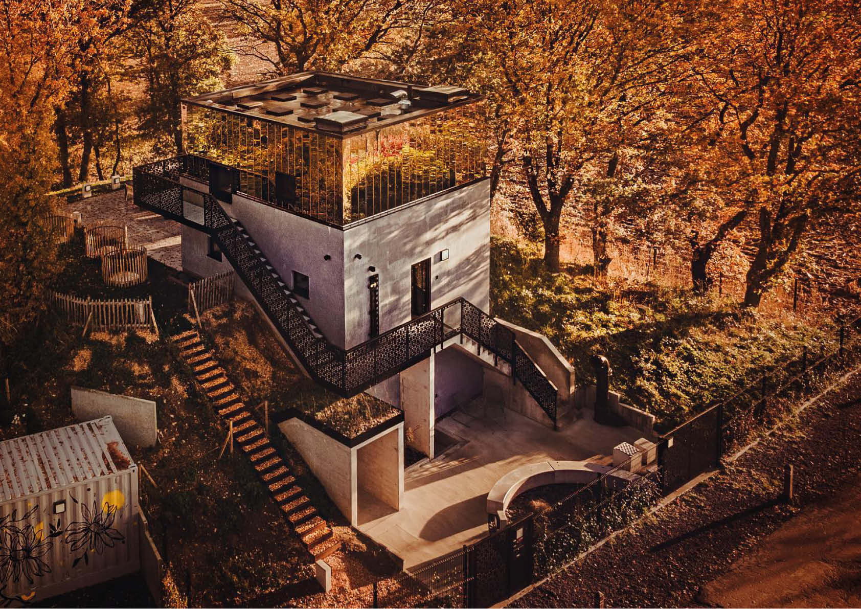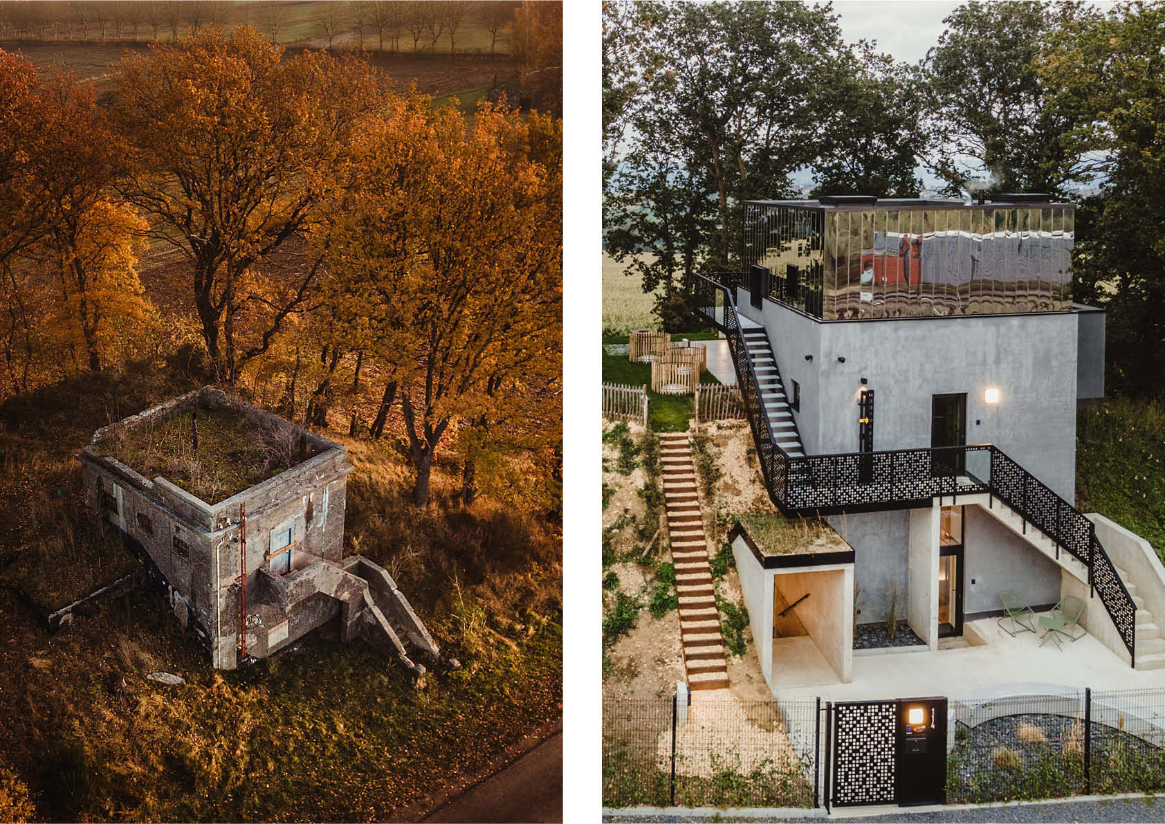 De bouwheer wilde een bescheiden oude watertoren omtoveren tot een bijzondere vakantiewoning. Het oorspronkelijke betonnen gebouw werd uitgebreid en uitgerust met een nieuwe verdieping. De gevels van die nieuwe verdieping zijn afgewerkt met een indrukwekkende ‘spiegelbekleding’, die de buitenomgeving reflecteert. De gevelbekleding bestaat uit op maat gemaakte cassettes van supergepolijste 304-inoxplaten, een keuze die zowel duurzaam als esthetisch verantwoord is. In het oorspronkelijke gebouw waren de ruimtes alleen verbonden door binnenladders en -luiken. De renovatie omvatte bijgevolg ook de installatie van een buitentrap om de circulatie te vergemakkelijken. De borstwering, die vervaardigd is uit S235-staal, werd op maat ontworpen met een pixelvormig design dat de interactie met de omringende natuur extra versterkt.